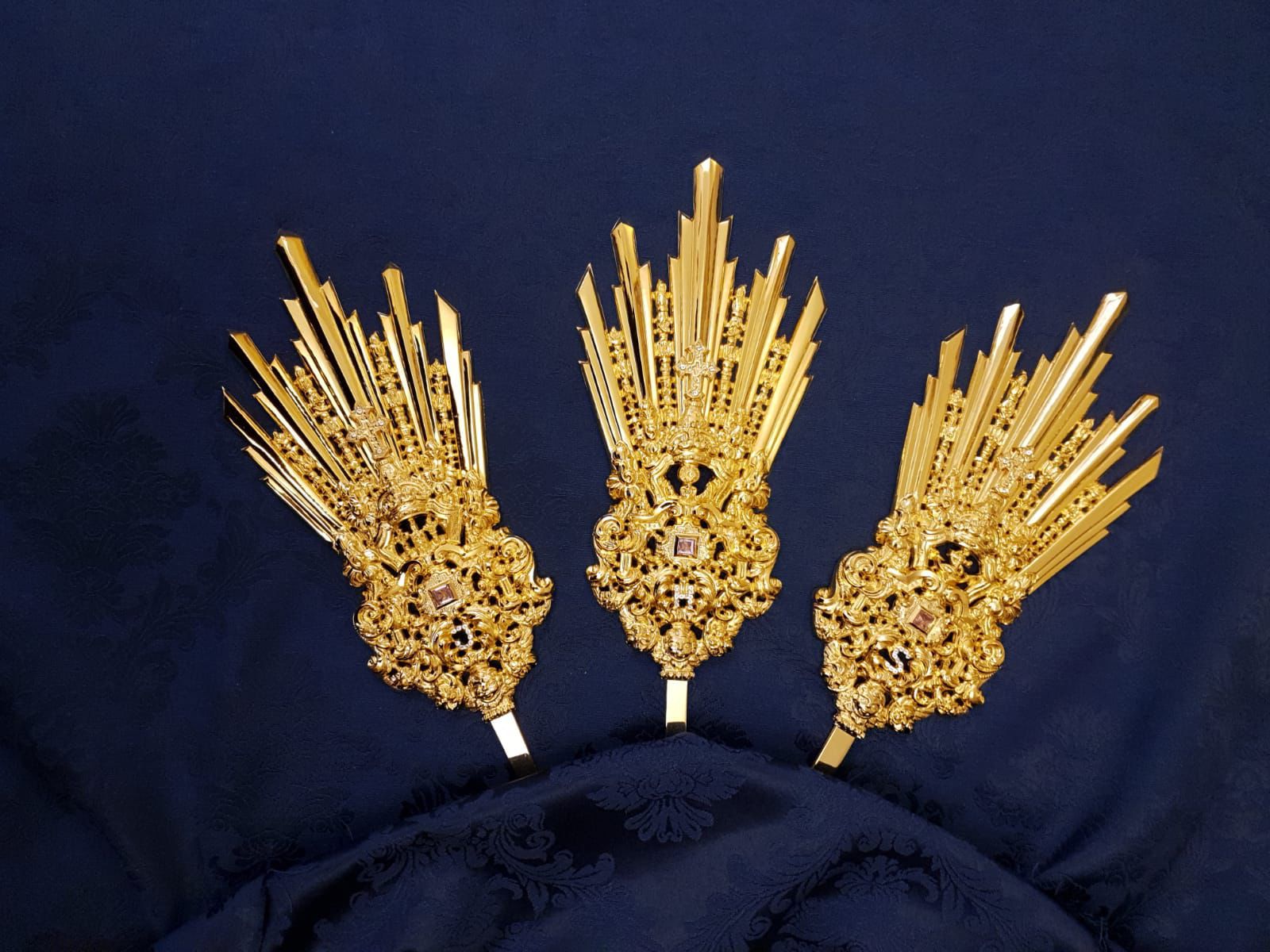 Detalle de las nuevas Potencias del Señor de Gran Poder donadas por un querido hermano de nuestra corporación y elaboradas por el orfebre sevillano Don José Ismael Moya Bos en plata de ley repujada y sobredorada. La potencia se asienta sobre un Ángel que será base de la ornamentación, con un dibujo serpenteante de volutas,…